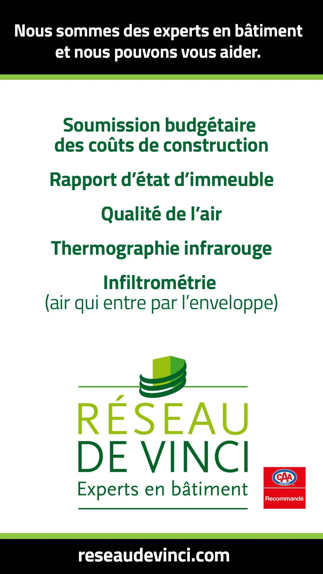 Réseau de Vinci est une firme d'experts en bâtiment qui oeuvre dans le marché résidentiel et commercial depuis presque 30 ans. On nous appelle pour trouver la source d'infiltration d'air et d'eau. Pour analyser la qualité de l'air. Pour déterminer le type de moisissures. Pour faire des rapports d'état d'immeuble pour les syndicats de copropriété. Pour aider les architectes, promoteurs immobiliers et entrepreneurs généraux à déterminer les coûts d'un projet de construction. On nous appelle également pour faire de l'expertise légale et faire des inspections préachat, prévente et de préréception.
